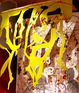 2009wandobject en ruimtelijke zuil: 112 kartonnenwerkjes (tekening schildering/collage/tekst/foto)op houten rekken met kunststof glas; de zuil 25x25 en 180 hoog. te huur op aanvraag