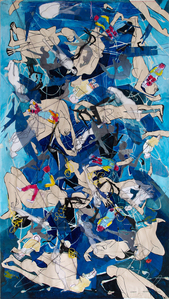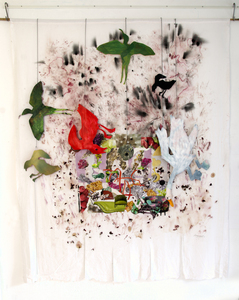 Een groot werk met vliegende vogels in een spannende lucht. Werk over vrij zijn.